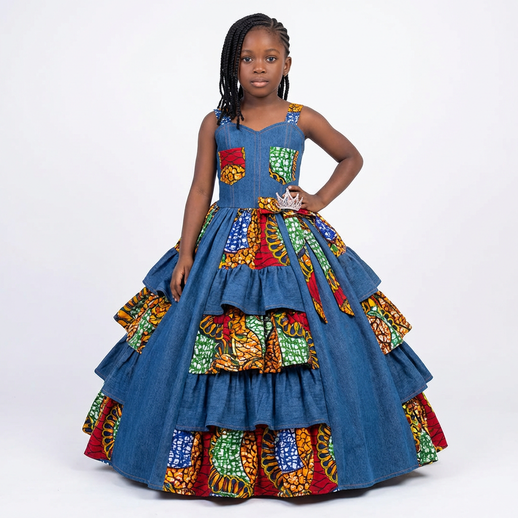 The Kids Jean & Ankara Princess Gown is a charming outfit designed for young girls who love to shine. This gown combines the strength of soft denim with the colorful beauty of Ankara fabric, creating a playful yet elegant look perfect for special occasions.