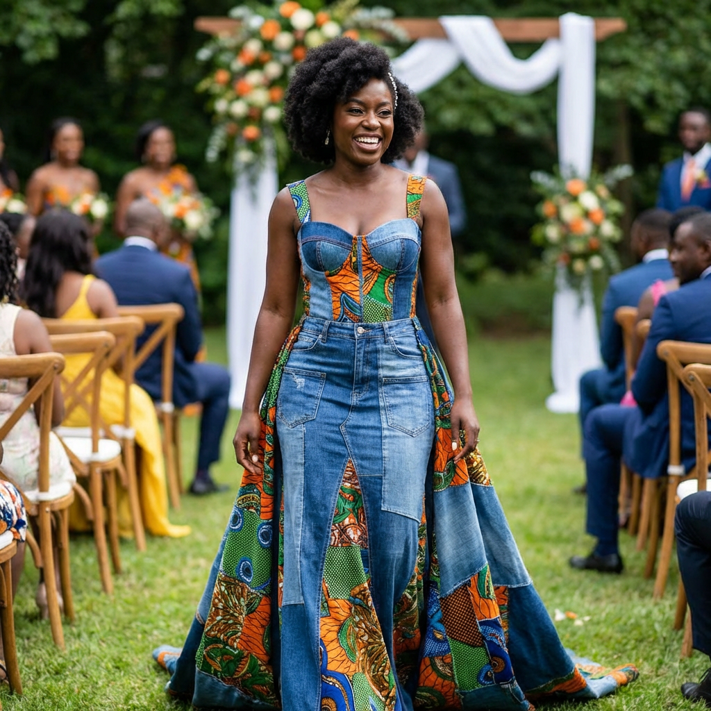 The fitted bodice is crafted with structured denim that adds durability and style, while carefully placed Ankara patterns create a beautiful contrast that celebrates African heritage. The flowing skirt gives the gown a graceful bridal silhouette, making it perfect for traditional weddings, receptions, or fashion-forward bridal photoshoots.